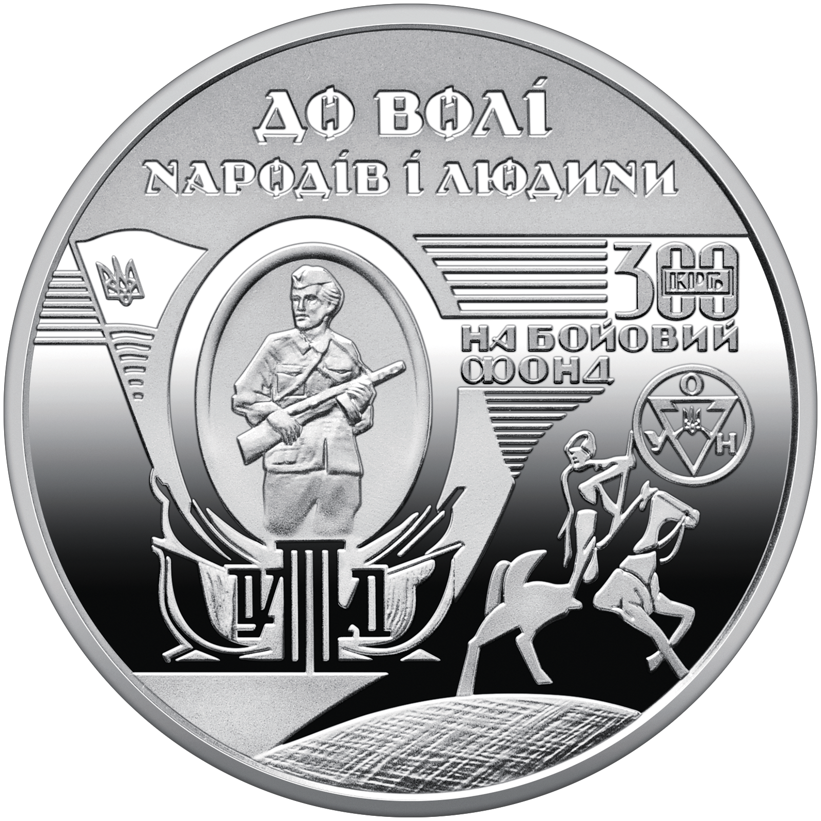 На реверсі монети зображено символічну композицію з фрагментів деревориту Ніла Хасевича, стилізовану під банкноту в дусі бофонів. Композиція містить елементи графіки митця як символу економічного, ідеологічного та морального ресурсу опору. Угорі на матовому тлі розміщено написи: ДО ВОЛІ / НАРОДІВ І ЛЮДИНИ та 300 КРБ / НА БОЙОВИЙ / ФОНД, що підкреслюють роль бофонів у зборі ресурсів для опору та співзвучні із сьогоднішньою практикою донатів. |