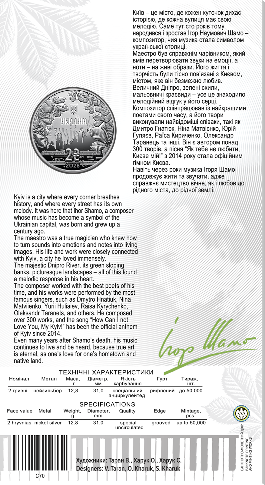 На аверсі монети зображено стилізовану композицію мальовничих краєвидів, знакових будівель та пам’ятників міста Києва, обрамлених листям каштанів – символічною візитівкою столиці. Нижче на дзеркальному тлі розміщено: нотний стан із записом музичного твору Ігоря Шамо, номінал 2 з графічним символом гривні та рік карбування – 2025. У центрі вгорі розташовано малий Державний Герб України та напис УКРАЇНА (крапки над літерою “ї” зображено у формі сердець). Унизу праворуч зазначено логотип Банкнотно-монетного двору Національного банку України. На реверсі монети зображено стилізований портрет Ігоря Шамо, який розмірковує над створенням нового музичного шедевру. Під портретом розміщено нотний стан, що символізує музичну спадщину композитора. Ліворуч від портрета вертикально зазначено написи ІГОР / ШАМО та роки життя митця 1925–1982. Композицію реверсу завершують зображення та силуети листя каштанів, які підкреслюють нерозривний зв’язок маестро з Києвом.