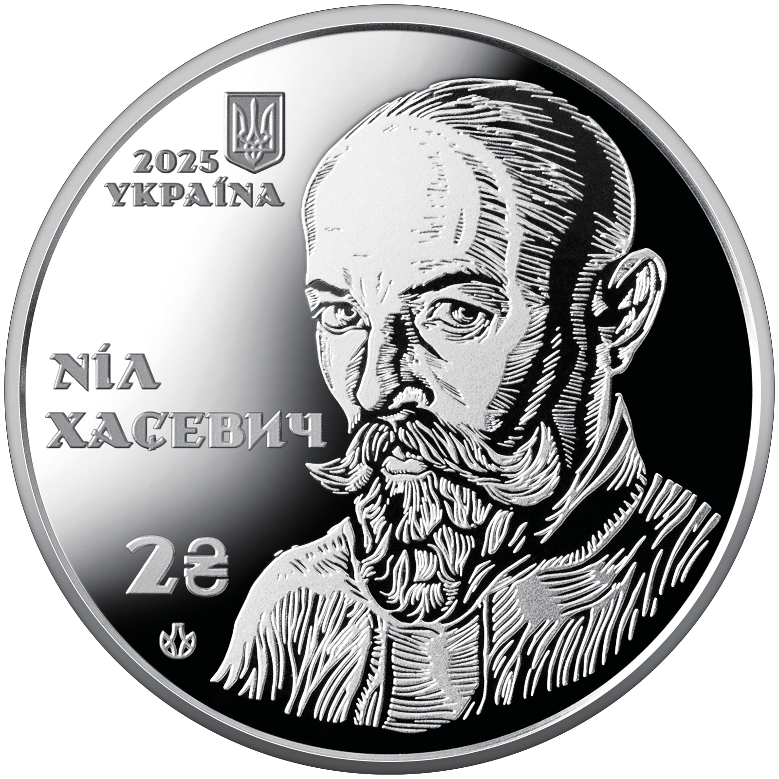 | На аверсі монети в центрі композиції розміщено автопортрет Ніла Хасевича, виконаний у характерній для митця техніці деревориту, що вирізняється експресивною графікою, контрастною лінійністю та динамічним штрихуванням. Ліворуч на дзеркальному тлі зображено: малий Державний Герб України, рік карбування 2025, напис УКРАЇНА (вгорі); напис НІЛ / ХАСЕВИЧ (по центру); номінал 2 з графічним знаком гривні та логотип Банкнотно-монетного двору Національного банку України (унизу). |