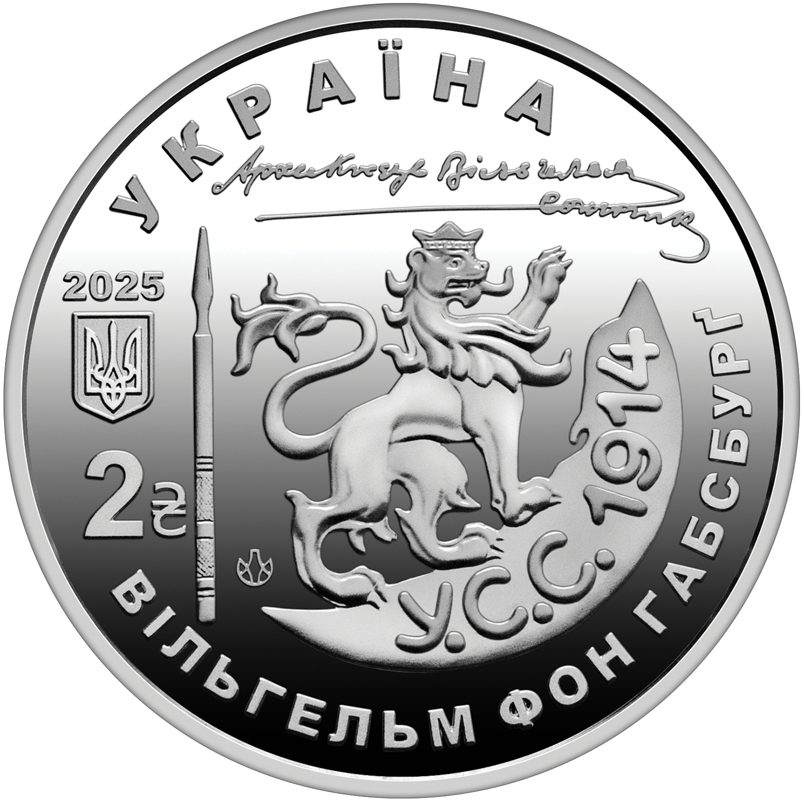 На аверсі монети зображено стилізовану композицію, що містить елемент кокарди легіону Українських січових стрільців – геральдичного галицького лева, який спирається на кам’яну брилу з написом У.С.С. 1914 (рік заснування легіону). На дзеркальному тлі розміщено: напис УКРАЇНА та факсиміле підпису Василя Вишиваного (угорі); рік карбування 2025, малий Державний Герб України, номінал 2 з графічним знаком гривні, стилізоване перо – символ його поетичної та дипломатичної діяльності, логотип Банкнотно-монетного двору Національного банку України та напис ВІЛЬГЕЛЬМ ФОН ГАБСБУРҐ (внизу).
