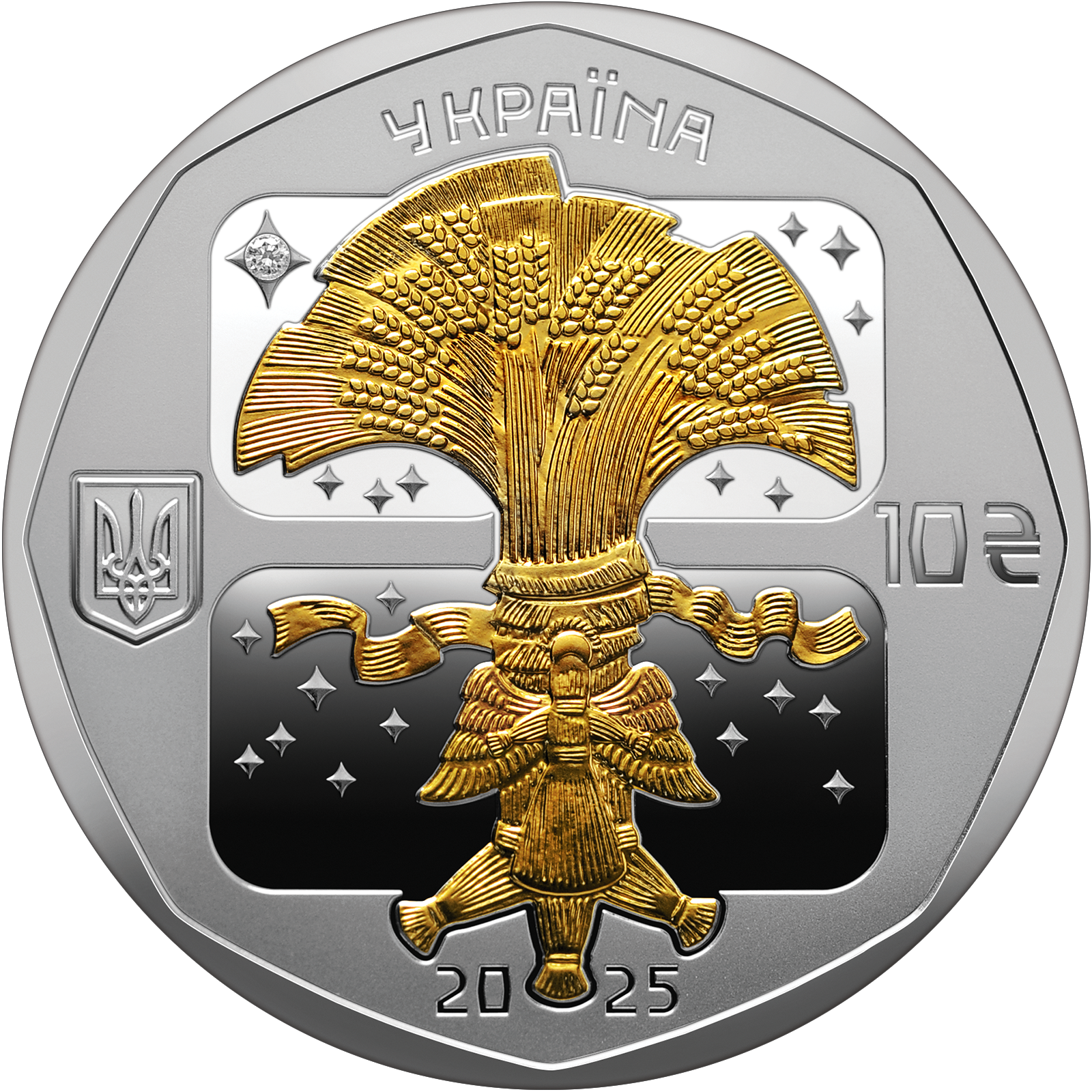 | На аверсі монети в центрі композиції розміщено стилізоване зображення солом’яного дідуха – традиційного атрибута українського Різдва (елемент оздоблення – локальна позолота). Основу дідуха прикрашає солом’яний янгол, що символізує захист і благу вість. Тло композиції розділене на дві площини, що нагадують вікно, осяяне світлом зірок у Святвечір. У центрі однієї із зірок (ліворуч) сяє діамант, що символізує Віфлеємську зорю. Угорі розміщено напис УКРАЇНА; унизу – рік карбування 2025; ліворуч – малий Державний Герб України; праворуч – номінал 10 та графічний знак гривні. |