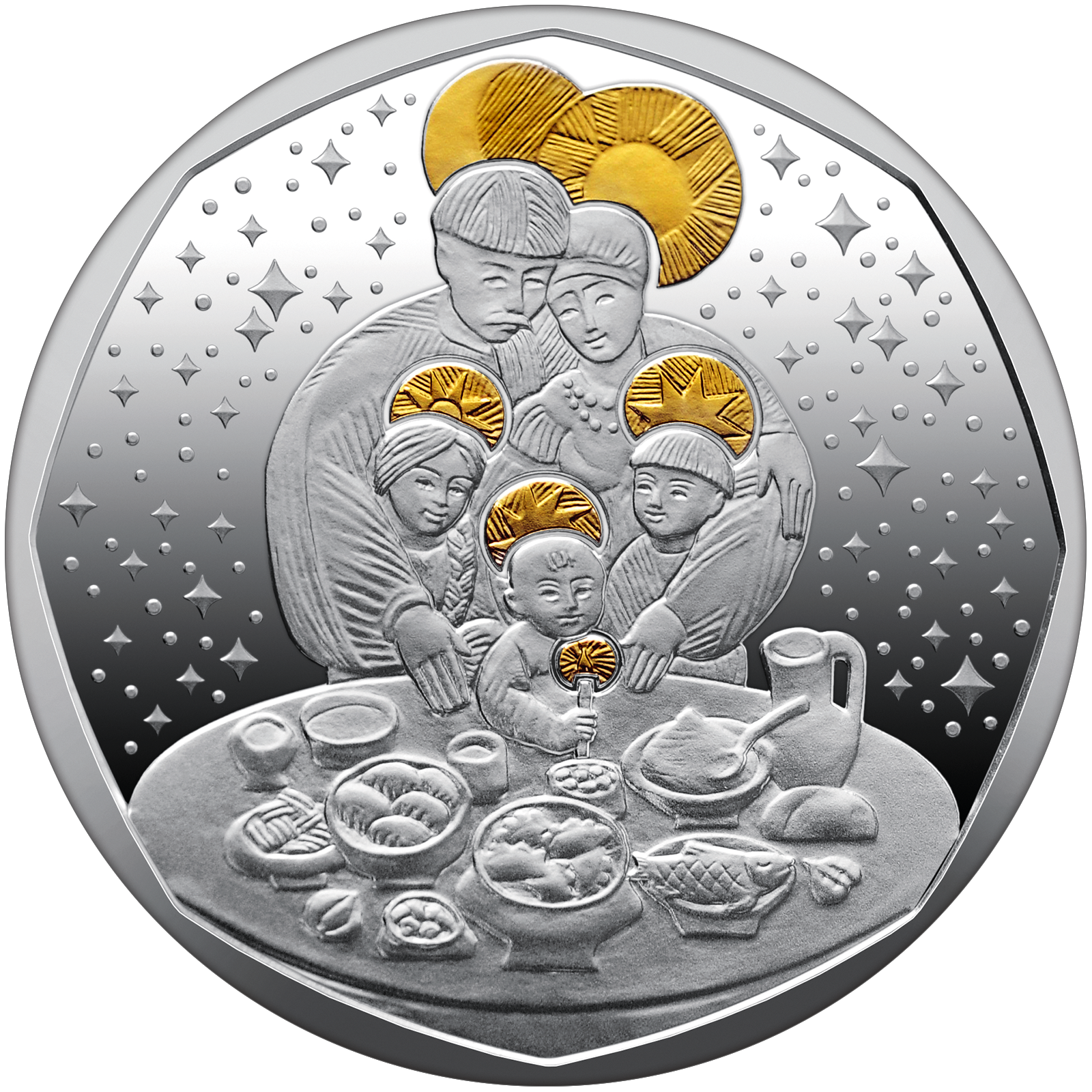 На реверсі монети зображена сповнена тепла і затишку традиційна передріздвяна трапеза української сім’ї, де образи батька, матері та дітей візуально ототожнюються з небесними світилами (елемент оздоблення – локальна позолота): німби навколо їхніх голів символізують Сонце (дружина), Місяць (чоловік) та зірки (їхні діти). Перед родиною – стіл із дванадцятьма стравами: кутею, варениками, пампухами, рибою та іншими традиційними частуваннями, а також головками часнику – оберегом від нечистої сили. |