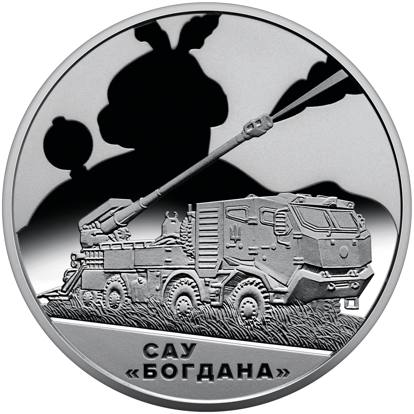 Пам’ятна монета присвячена самохідній артилерійській установці “Богдана” – знаковому символу військової потужності та інженерної майстерності України. Ця 155-мм гаубиця на колісному шасі, розроблена з урахуванням передових технологічних рішень, стала ключовим елементом артилерійського потенціалу Збройних Сил України. Завдяки високоточному ураженню цілей вона демонструє стратегічну місію українського оборонно-промислового комплексу.