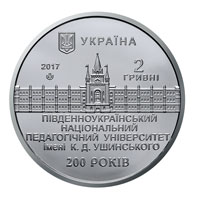 | На аверсі монети розміщено: угорі малий Державний Герб України, напис УКРАЇНА; рік карбування монети - 2017, логотип Банкнотно-монетного двору Національного банку України та номінал 2/ГРИВНІ; у центрі на дзеркальному тлі - фрагмент логотипу Південноукраїнського національного педагогічного університету імені К. Д. Ушинського, під яким написи: ПІВДЕННОУКРАЇНСЬКИЙ/НАЦІОНАЛЬНИЙ/ПЕДАГОГІЧНИЙ УНІВЕРСИТЕТ/ ІМЕНІ К. Д. УШИНСЬКОГО/200 РОКІВ. |