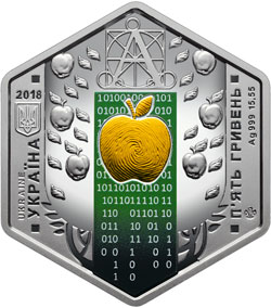 | На аверсі монети `Ера технологій` розміщено: ліворуч: рік карбування монети 2018, малий Державний Герб України та написи UKRAINE/УКРАЇНА (вертикально); праворуч - номінал монети П`ЯТЬ ГРИВЕНЬ, позначення металу, маси монети в чистоті - Ag 999 15,55 (вертикально) та логотип Банкнотно-монетного двору Національного банку України (унизу); угорі на дзеркальному тлі стилізованого зображення дерева життя з плодами-яблуками - графічна побудова початкової літери алфавіту `А` як символ пізнання, письма, грамотності, під якою стилізовану композицію, що символізує розвиток високих технологій: на зеленому тлі, заповненому цифрами двійкового коду (використано тамподрук), зображено яблуко (локальна позолота) з відбитком пальця людини. |