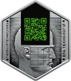 На реверсі монети розміщено: на дзеркальному тлі, заповненому цифрами двійкового коду, барельєфне зображення голови людини зі схемою пропорцій обличчя, визначеною Леонардо да Вінчі, угорі - на чорному тлі кольоровий QR-код (використано тамподрук) - двовимірний матричний штрих-код як символ досягнень буквено-цифрового кодування, що використовується в усьому світі; вертикальні написи: THE ERA OF TECHNOLOGIES (ліворуч) та ЕРА ТЕХНОЛОГІЙ (праворуч). |