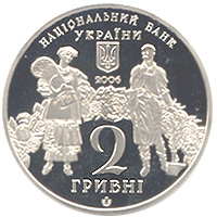 | На аверсі монети зображено фрагмент оформлення купюри 1918 року - селянка та робітник на тлі вінка з квітів і плодів, над яким розміщено рік карбування монети 2006, малий Державний Герб України та напис - НАЦІОНАЛЬНИЙ БАНК (півколом)/ УКРАЇНИ; унизу - 2/ ГРИВНІ та логотип Монетного двору Національного банку України. |