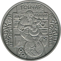 Присвячена одному з важливих видів господарської діяльності та мистецької культури українців - гончарству, яке протягом багатьох століть посідало одне з провідних місць серед селянських промислів й увібрало в себе технічні навички та художні традиції, що існували ще з часів неоліту. Монету виготовлено з використанням технології патинування.