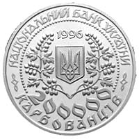 | На аверсі монети в центрі кола, утвореного намистовим узором, знаходиться зображення малого Державного герба України в обрамленні з двох боків гілками калини. Над гербом розміщена дата 1996 - рік карбування монети. По колу монети написи: вгорі НАЦІОНАЛЬНИЙ БАНК УКРАЇНИ, внизу у два рядки- 200000 КАРБОВАНЦІВ |