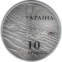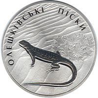 На реверсі монети на матовому тлі пустельного пейзажу зображено ящірку, угорі півколом - напис ОЛЕШКІВСЬКІ ПІСКИ. |