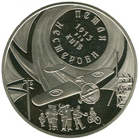 Монета присвячена 100-річчю виконання фігури вищого пілотажу - `мертвої петлі`, відомої також як `петля Нестерова`.