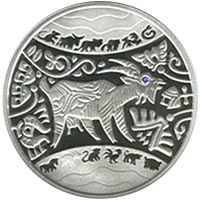 На реверсі монети в оточенні стилізованого рослинного орнаменту зображено в лубочному стилі козу, око якої оздоблено кубічним оксидом цирконію блакитного кольору. Над цією композицією і під нею розміщено абрисні фігурки всіх 12 символів східного календаря. |
