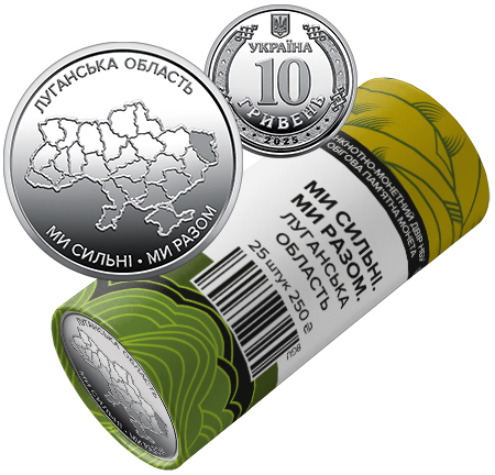 Обігова пам’ятна монета “Ми сильні. Ми разом. Луганська область”, присвячена невід’ємній частині України, визначеній Конституцією України, – Луганській області. Її територіальна належність до України підтверджена міжнародним правом і визнана світовою спільнотою.