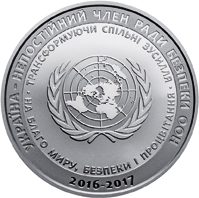 На реверсі монети на дзеркальному тлі зображено емблему ООН, навколо якої написи: ТРАНСФОРМУЮЧИ СПІЛЬНІ ЗУСИЛЛЯ НА БЛАГО МИРУ, БЕЗПЕКИ І ПРОЦВІТАННЯ та написи на матовому тлі по колу: УКРАЇНА - НЕПОСТІЙНИЙ ЧЛЕН РАДИ БЕЗПЕКИ ООН, 2016-2017. |