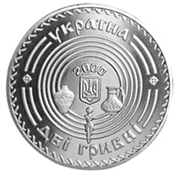 | На аверсі монети у центрі концентричних кіл, розділених солярними знаками, зображено Державний герб України в оточенні керамічних виробів трипільської культури, відкритих В.Хвойкою під час археологічних досліджень. На монеті розміщено стилізовані написи у чотири рядки: УКРАЇНА, 2000, ДВІ, ГРИВНІ |