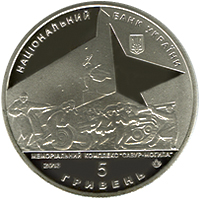 | На аверсі монети розміщено: угорі півколом напис НАЦІОНАЛЬНИЙ БАНК УКРАЇНИ, під яким праворуч малий Державний Герб України; у центрі - меморіальний комплекс, присвячений воїнам-визволителям, під ним - його назва МЕМОРІАЛЬНИЙ КОМПЛЕКС `САВУР-МОГИЛА`; рік карбування монети - 2013; унизу - номінал 5/ГРИВЕНЬ та логотип Монетного двору Національного банку України. |