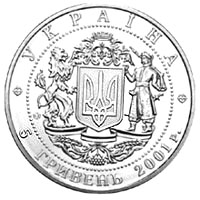 | На аверсі монети в намистовому колі зображено увінчану вінцем композицію, що втілює ідею соборності України: малий Державний Герб України в оточенні рослинного орнаменту підтримують лев та козак з мушкетом і кругові написи: УКРАЇНА, 5 ГРИВЕНЬ, 2001 р. та логотип Монетного двору Національного банку України |