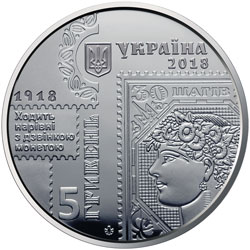 | На аверсі монети розміщено: малий Державний Герб України, праворуч від якого написи УКРАЇНА/2018, під якими відтворено фрагмент марки 30 шагів, ліворуч - номінал монети 5 ГРИВЕНЬ (вертикальний напис) та написи: 1918, ХОДИТЬ/НАРІВНІ/З ДЗВІНКОЮ/МОНЕТОЮ; логотип Банкнотно-монетного двору Національного банку України (унизу). |