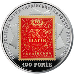 На реверсі монети на дзеркальному тлі розміщено кольорове зображення марки 50 шагів (використано тамподрук) та написи: ПЕРШІ ПОШТОВІ МАРКИ УКРАЇНСЬКОЇ НАРОДНОЇ РЕСПУБЛІКИ (по колу), 100 РОКІВ (унизу). |