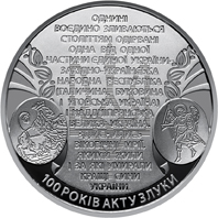 На реверсі монети на дзеркальному тлі розміщено фрагмент Акта Злуки: ОДНИНІ/ВОЄДИНО ЗЛИВАЮТЬСЯ/СТОЛІТТЯМ ОДІРВАНІ/ОДНА ВІД ОДНОЇ/ЧАСТИНИ ЄДИНОЇ УКРАЇНИ -/ ЗАХІДНО-УКРАЇНСЬКА/ НАРОДНА РЕСПУБЛІКА/ (ГАЛИЧИНА, БУКОВИНА/ І УГОРСЬКА УКРАЇНА)/ І НАДДНІПРЯНСЬКА/ВЕЛИКА УКРАЇНА./ ЗДІЙСНИЛИСЬ/ ВІКОВІЧНІ МІРЇ,/ЯКИМИ ЖИЛИ/І ЗА ЯКІ УМИРАЛИ/КРАЩІ СИНИ/ УКРАЇНИ. Латентним зображенням на тексті проглядається зображення Тризуба. Ліворуч і праворуч від напису розміщено медальони із зображеннями символів земель: лева - Західної України (ліворуч) та Архангела Михаїла - центральної України (праворуч), від яких угору йде стилізований рослинний орнамент у вигляді лаврових галузок, унизу напис півколом 100 РОКІВ АКТУ ЗЛУКИ.