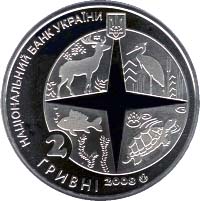 | На аверсі монети зображено композицію - коло, що розділене розою вітрів на чотири частини, кожна з яких символізує класи ссавців, птахів, риб, земноводних, які представлені в зоопарку; угорі - малий Державний Герб України та розміщено написи НАЦІОНАЛЬНИЙ БАНК УКРАЇНИ (ліворуч півколом), унизу - 2/ ГРИВНІ 2008 та логотип Монетного двору Національного банку України. |