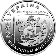 На аверсі монети зображено стилізовану композицію, що містить елемент кокарди легіону Українських січових стрільців – геральдичного галицького лева, який спирається на кам’яну брилу з написом У.С.С. 1914 (рік заснування легіону). На дзеркальному тлі розміщено: напис УКРАЇНА та факсиміле підпису Василя Вишиваного (угорі); рік карбування 2025, малий Державний Герб України, номінал 2 з графічним знаком гривні, стилізоване перо – символ його поетичної та дипломатичної діяльності, логотип Банкнотно-монетного двору Національного банку України та напис ВІЛЬГЕЛЬМ ФОН ГАБСБУРҐ (внизу).
