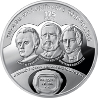 На реверсі монети на дзеркальному тлі зображено портрети членів товариства: Т. Шевченка (ліворуч), М. Костомарова (по центру), П. Куліша (праворуч), унизу – відбиток сургучевої печатки; написи: КИРИЛО-МЕФОДІЇВСЬКЕ ТОВАРИСТВО (угорі півколом), 175/РОКІВ (над портретами), ТАРАС ШЕВЧЕНКО (під портретом Т. Шевченка), МИКОЛА КОСТОМАРОВ (під портретом М. Костомарова), ПАНТЕЛЕЙМОН КУЛІШ (під портретом П. Куліша), «І ПІЗНАЄТЕ ІСТИНУ, І ІСТИНА ВИЗВОЛИТЬ ВАС» (півколом над відбитком печатки). |