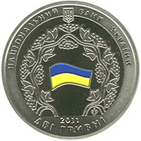 На аверсі монети розміщено: угорі малий Державний Герб України та напис півколом НАЦІОНАЛЬНИЙ БАНК УКРАЇНИ, унизу рік карбування монети, номінал - 2011/ДВІ ГРИВНІ, логотип Монетного двору Національного банку України; у центрі зображено Державний Прапор України (елемент оздоблення - емаль) в обрамленні стилізованого калинового вінка.