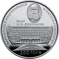 На реверсі монети розміщено портрет В. В. Докучаєва, зображення сучасної будівлі університету та написи півколом: ХАРКІВСЬКИЙ НАЦІОНАЛЬНИЙ АГРАРНИЙ УНІВЕРСИТЕТ (угорі півколом), ІМЕНІ В. В. ДОКУЧАЄВА (над будівлею), 200 РОКІВ (унизу).