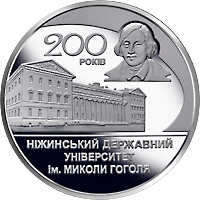На реверсі монети на дзеркальному тлі розміщено будівлю університету, над якою напис – 200/РОКІВ та зображено портрет Миколи Гоголя (праворуч), унизу напис: НІЖИНСЬКИЙ ДЕРЖАВНИЙ/ УНІВЕРСИТЕТ/ ІМ. МИКОЛИ ГОГОЛЯ.