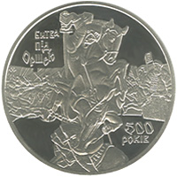 На реверсі монети зображено символічну композицію битви, в основі якої - стилізовані фрагменти полотна `Битва під Оршею`, створеного невідомим учасником битви, праворуч зображено князя Костянтина Острозького та розміщено стилізовані написи: БИТВА/ПІД/ОРШЕЮ (угорі ліворуч), 500/РОКІВ (унизу праворуч). |