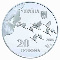 | На аверсі монети зображено клин журавлів, який зникає у хмарах, та розміщено напис УКРАЇНА (угорі), малий Державний Герб України (праворуч), під клином праворуч - рік карбування монети 2005, нижче - позначення металу та його проби - Ag 925, маса в чистоті - 62,2 та логотип Монетного двору Національного банку України, унизу номінал - 20/ ГРИВЕНЬ. |