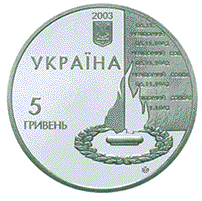 | На аверсі монети розміщено: угорі рік карбування монети 2003, під ним малий Державний Герб України та написи у три рядки: УКРАЇНА, 5 ГРИВЕНЬ; праворуч на монетах зображено меморіальну дошку та вічний вогонь,та логотип Монетного двору Національного банку України. |