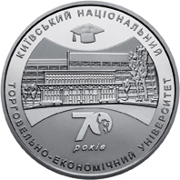 На реверсі монети зображено будівлю університету та розміщено написи: 70 РОКІВ (під будівлею) КИЇВСЬКИЙ НАЦІОНАЛЬНИЙ (півколом угорі) ТОРГОВЕЛЬНО-ЕКОНОМІЧНИЙ УНІВЕРСИТЕТ (унизу). |