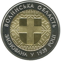 На аверсі монети розміщено: угорі малий Державний Герб України, по колу написи: НАЦІОНАЛЬНИЙ БАНК УКРАЇНИ (угорі), П`ЯТЬ ГРИВЕНЬ (унизу), праворуч - логотип Монетного двору Національного банку України; у центрі - стилізовану композицію: зображення башти Луцького замку, Успенського собору в м. Володимирі-Волинському, острова на озері Світязь, під яким рік карбування монети - 2014, а також лебедя (угорі), колосся та квіток льону (унизу). На реверсі монети зображено герб області, по колу розміщено написи: ВОЛИНСЬКА ОБЛАСТЬ (угорі), ЗАСНОВАНА У 1939 РОЦІ (унизу).