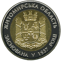 На реверсі монети зображено герб області та по колу розміщено написи: ЖИТОМИРСЬКА ОБЛАСТЬ (угорі), ЗАСНОВАНА У 1937 РОЦІ (унизу).