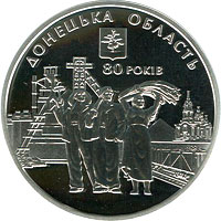 На реверсі монети зображено: на тлі промислового пейзажу області фігури металурга, шахтаря та робітниці сільського господарства, праворуч - Спасо-Преображенський кафедральний собор м. Донецька, угорі півколом напис ДОНЕЦЬКА ОБЛАСТЬ, під ним герб області та напис 80 РОКІВ. |