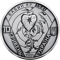 На аверсі монети розміщено: малий Державний Герб України (праворуч), під яким вертикальний напис під кутом УКРАЇНА; ліворуч номінал – 10 ГРИВЕНЬ (вертикально під кутом); у центрі на тлі концентричних кіл, що нагадують мішень, та фрагмента топографічного зображення Бабиного Яру, що нагадує цівки крові, – стилізована композиція – пронизане кулею серце; написи: БАБИН ЯР 1941 (угорі півколом), рік карбування монети 2021 (унизу). На реверсі монети зображено художньо-образну композицію, що відображає трагедію Бабиного Яру, – антропоморфні фігури, що нібито лежать під землею та уособлюють розстріляні сім’ї. Угорі розміщено напис: 80-ТІ РОКОВИНИ/ТРАГЕДІЇ В БАБИНОМУ ЯРУ.