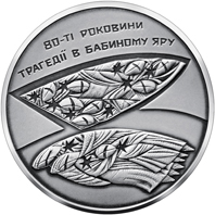 На реверсі монети зображено художньо-образну композицію, що відображає трагедію Бабиного Яру, – антропоморфні фігури, що нібито лежать під землею та уособлюють розстріляні сім’ї. Угорі розміщено напис: 80-ТІ РОКОВИНИ/ТРАГЕДІЇ В БАБИНОМУ ЯРУ.