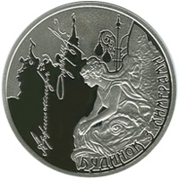 На реверсі монети на дзеркальному тлі контуру будинку з химерами рельєфно зображено фрагмент скульптурної композиції, що прикрашає фасад будівлі; вертикально на дзеркальному тлі розміщено факсиміле архітектора, унизу праворуч півколом розміщено напис БУДИНОК З ХИМЕРАМИ. |