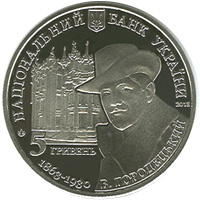 На аверсі монети розміщено: угорі малий Державний Герб України, напис півколом НАЦІОНАЛЬНИЙ БАНК УКРАЇНИ, під яким (праворуч) рік карбування монети - 2013; на тлі будинку з химерами зображено портрет з написом півколом В. ГОРОДЕЦЬКИЙ, ліворуч від якого - роки життя архітектора 1863 - 1930, над якими номінал - 5 ГРИВЕНЬ та логотип Монетного двору Національного банку України.