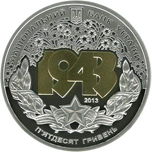 | На аверсі монети розміщено: угорі малий Державний Герб України та напис півколом НАЦІОНАЛЬНИЙ БАНК УКРАЇНИ; у центрі - композицію, що символізує перемогу: цифри 1943 ( позолочені), над якими - зображення салюту, унизу - лаврова гілка зі стрічкою та зіркою, праворуч над зіркою - рік карбування монети 2013; унизу напис півколом - П`ЯТДЕСЯТ ГРИВЕНЬ. Елемент оздоблення - локальна позолота, вміст золота в чистоті - не менше ніж 0,003 г. |