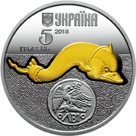 | На аверсі монети розміщено: угорі малий Державний Герб України, напис УКРАЇНА, під яким рік карбування монети 2018 та номінал 5/ГРИВЕНЬ; у центрі - позолочене зображення (елемент оздоблення: локальна позолота, вміст золота в чистоті не менше ніж 0,0004 г) дельфіна - фібула у вигляді дельфіна з Ногайчинського кургану (сарматська доба), під ним - ольвійську монету (IV ст. до н. е.). |