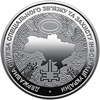 На реверсі монети розміщено стилізовану композицію: на тлі друкованих плат зображено дзеркальний абрис України з ключем – символом криптографічного захисту інформації та напис: ДЕРЖАВНА СЛУЖБА СПЕЦІАЛЬНОГО ЗВ’ЯЗКУ ТА ЗАХИСТУ ІНФОРМАЦІЇ УКРАЇНИ (по колу). |