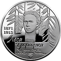 На реверсі монети на тлі стилізованих гілок із листям зображено портрет Лесі Українки; ліворуч – роки життя 1871/1913; написи: ЛЕСЯ/ УКРАЇНКА (під портретом), Л. КОСАЧ-КВІТКА/ (В ЛІТЕРАТУРІ ЛЕСЯ УКРАЇНКА) (факсиміле Лесі Українки). |