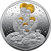 На реверсі монети зображена сповнена тепла і затишку традиційна передріздвяна трапеза української сім’ї, де образи батька, матері та дітей візуально ототожнюються з небесними світилами (елемент оздоблення – локальна позолота): німби навколо їхніх голів символізують Сонце (дружина), Місяць (чоловік) та зірки (їхні діти). Перед родиною – стіл із дванадцятьма стравами: кутею, варениками, пампухами, рибою та іншими традиційними частуваннями, а також головками часнику – оберегом від нечистої сили. |