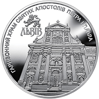 На реверсі монети зображено фасад будівлі храму, угорі ліворуч від якого – лев та напис ЛЬВІВ (під левом); написи: ГАРНІЗОННИЙ ХРАМ СВЯТИХ АПОСТОЛІВ ПЕТРА І ПАВЛА (півколом ліворуч). |