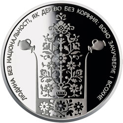На реверсі монети на дзеркальному тлі розміщено стилізовану композицію: дерево життя, по обидва боки від якого глечики, з яких ллється вода, що підживлює дерево; по колу - вислів письменника: ЛЮДИНА БЕЗ НАЦІОНАЛЬНОСТІ, ЯК ДЕРЕВО БЕЗ КОРІННЯ: ВОНО ЗАЧУЧВЕРІЄ І ВСОХНЕ. |
