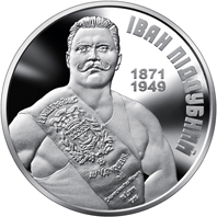 На реверсі монети на дзеркальному тлі зображено І. Піддубного, праворуч від якого – роки життя 1871/1949 та напис ІВАН ПІДДУБНИЙ (півколом праворуч).