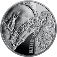 На реверсі монети ліворуч зображено голову коня, праворуч від якого на дзеркальному тлі розміщено вертикальний напис КІНЬ (унизу) та фрагмент шиферної плити ХІ ст. із зображенням святих вершників, що топчуть змій. |
